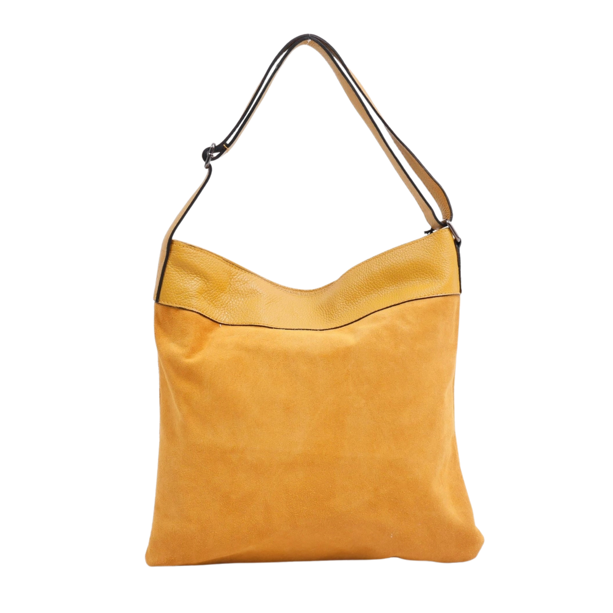 Made in Italy from 100% fine suede Italian leather, this timeless piece features a minimalist silhouette with a zippered closure, adjustable strap and a gorgeous mustard hue. Versatile design that allows for shoulder or crossbody wear.