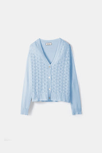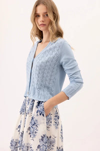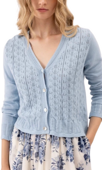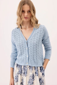 Our Patty Knit Cardigan features a delicate crochet stitch, scalloped hem, and a flattering V-neckline. Crafted from an ultra-soft yarn in a subtle yet eye-catching hue, it adds just the right pop to any outfit.
