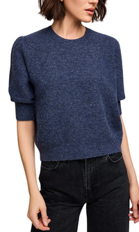 Crafted from a cozy brushed yarn, it features a textured horizontal knit for subtle dimension. Designed with a classic crew neckline, flattering half sleeves, and gentle puff details at the shoulders, this piece is effortlessly chic.