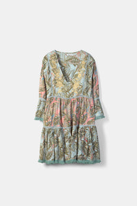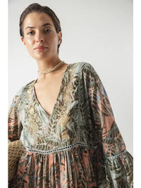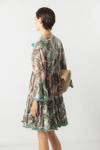 Our palm print embroidered dress showcases a beautifully muted print, intricate embroidery, and a tiered skirt for effortless movement. Designed with 3/4 flared sleeves and, perfect frayed hems and a flattering mini length, it’s the perfect choice for late summer weddings, evening soirées, or simply elevating your casual outings.