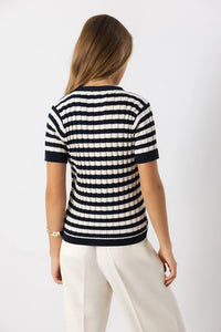 This lightweight striped knit features short sleeves, a semi-fitted silhouette, and a flattering V-neckline with button-front detail. Perfect for everyday wear or dressing up with ease, it’s an ideal transition piece for shifting seasons.