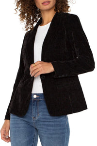 The soft, stretch velvet fabric offers comfort while its semi-fitted design provides a sleek, flattering silhouette. Featuring a front button closure, this versatile blazer transitions effortlessly from casual to dressy. Pair it with jeans for a laid-back, chic vibe or style it with dress pants and a silk shirt for an elevated, elegant look.