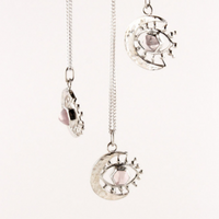 A hand-textured sterling silver moon and eye set with a pointed hexagon rose quartz pendant.