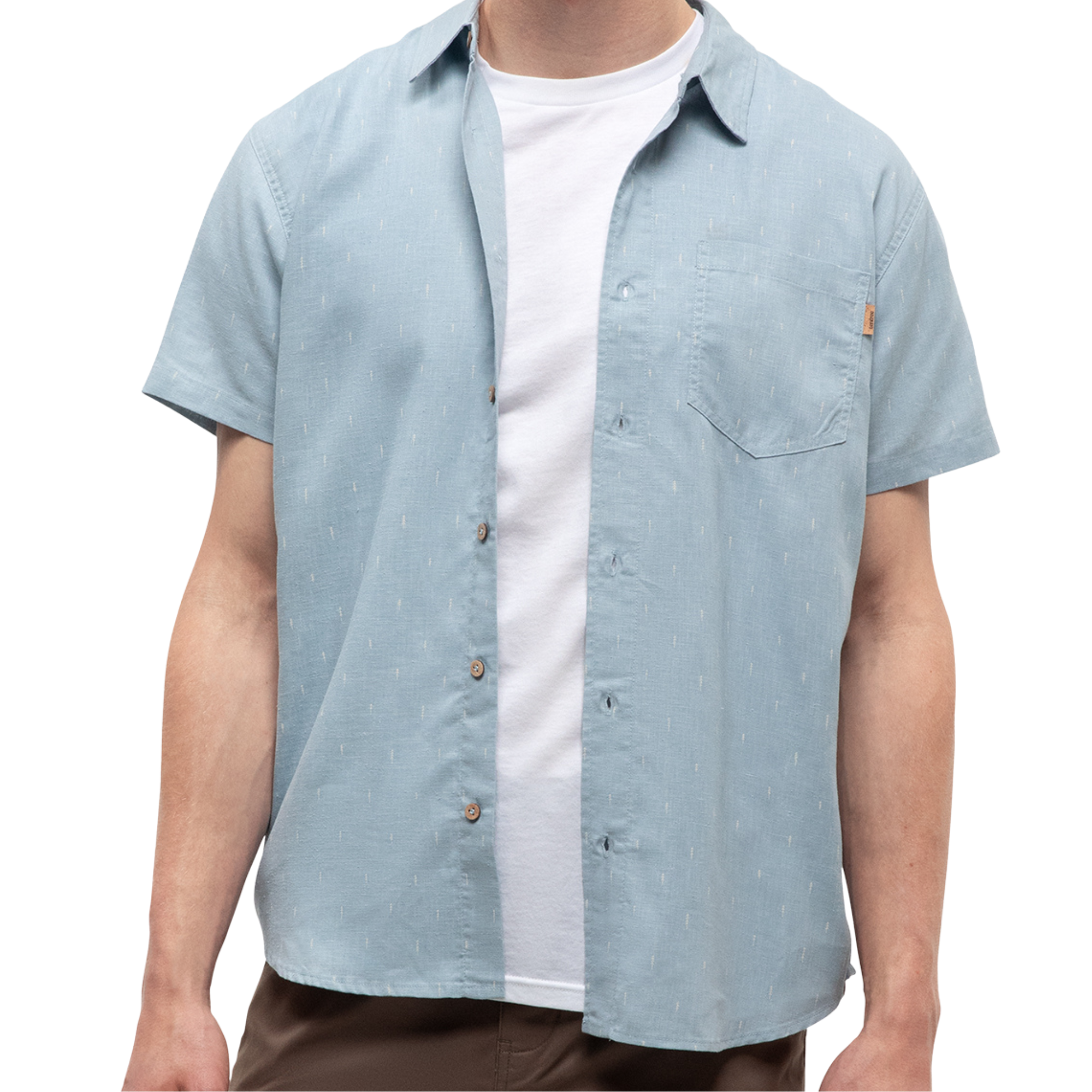 Made from a breathable blend of natural hemp and recycled polyester, it delivers lightweight comfort that lasts. Finished with a chest pocket, button front, and signature small tree prin.