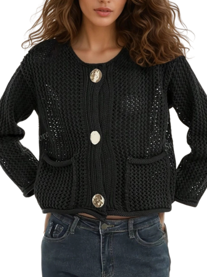 Crochet Gold Button Crochet Cardigan - Rich Black