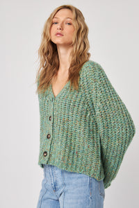 Designed with a slouchy, slightly cropped cut, this button-up knit offers a relaxed fit and an easy, flattering silhouette. The chunky texture adds cozy appeal without feeling heavy, making it a versatile piece for layering or wearing on its own.