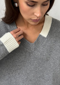 The Jaime Sweater refreshes the classic v-neck with a beautifully soft cashmere blend, relaxed silhouette, and striking contrast trim at the neckline and hem. It’s simple, modern, and subtly eye-catching — the kind of piece that makes your outfit feel instantly more polished.