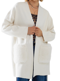 Made in small batches and crafted from a beautifully soft viscose blend, this longline knit features a relaxed, oversized silhouette that drapes effortlessly for a refined, easygoing look. The standout detail? Plush fur-accented pockets that add a touch of glam while keeping things cozy. Designed in a versatile cream tone, it blends seamlessly into any wardrobe and elevates every outfit with quiet sophistication.