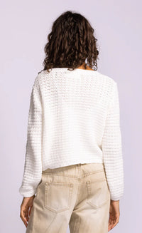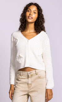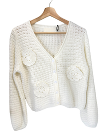 This white, semi-cropped cardigan features an open-knit construction with textured stitches, a flattering V-neckline, and button-front closure. Finished with subtle crochet floral applique, it adds a touch of sweetness to your everyday style.