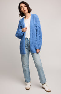 Crafted in a stunning blue tone, this cardigan features a relaxed open-front silhouette, luxurious soft-yarn, and eye-catching cabled textures. Rolled sleeve hems add an effortless detail that makes it feel lived-in and chic.