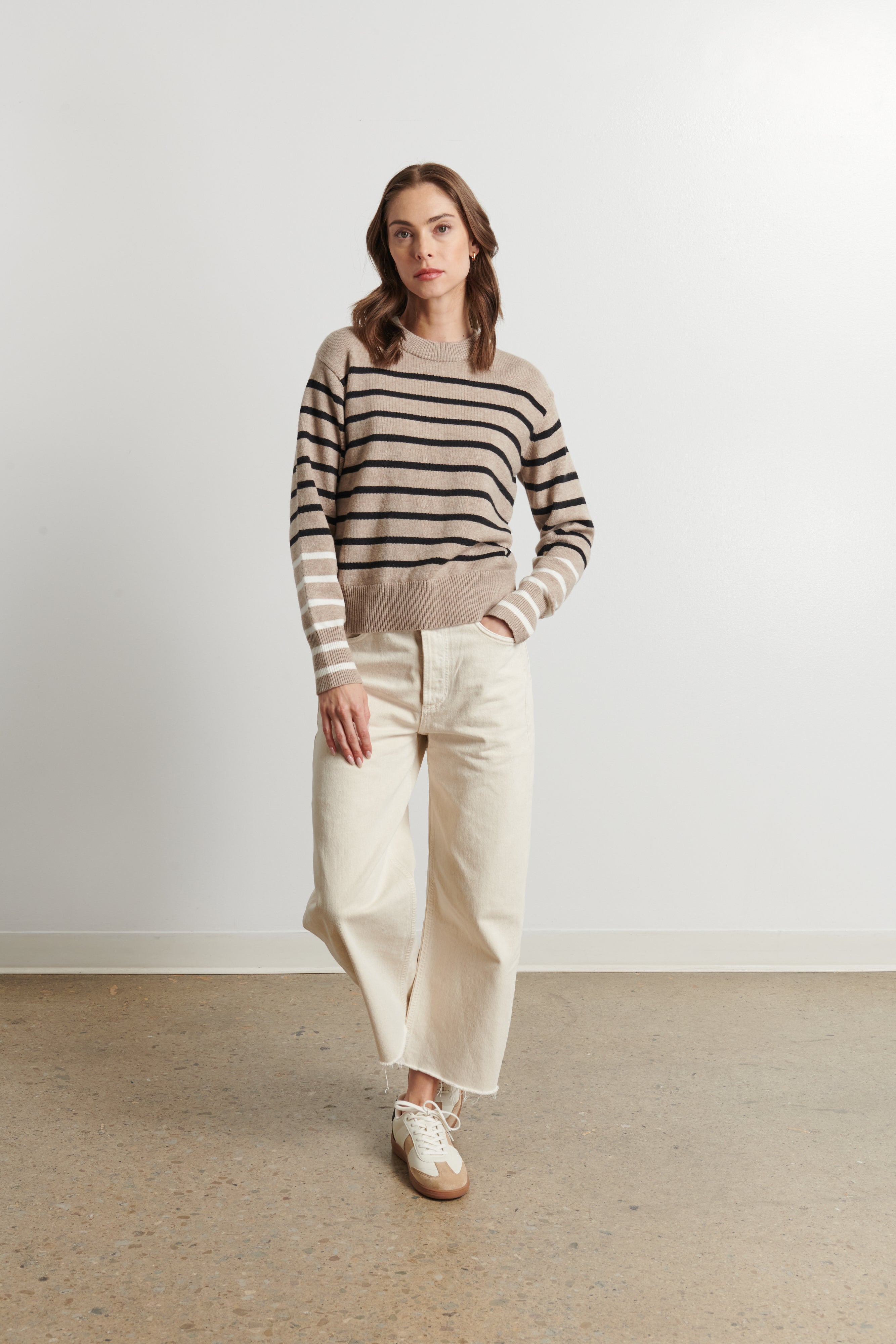 The Dasha Crew is crafted from a beautifully soft blend of fabrics, offering a relaxed fit with a semi-cropped silhouette that feels modern yet timeless. Designed with ribbed cuffs and hem for subtle structure, it features eye-catching contrast stripes that add a playful touch of personality. The neutral base makes it effortlessly easy to pair and perfect for year-round wear.