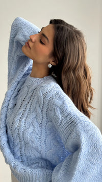 Crafted from an ultra-soft yarn, it features a one-size, relaxed silhouette, crew neckline, and bold cable detailing. The gently flared sleeves add a feminine touch, giving this cozy knit an elevated, contemporary feel.